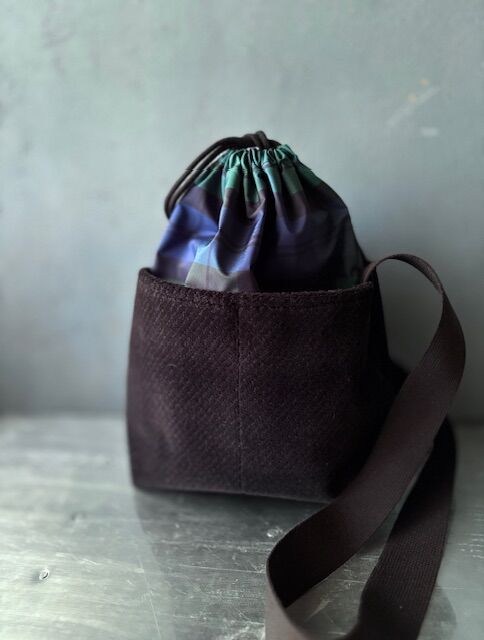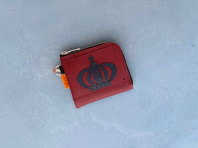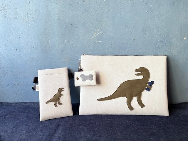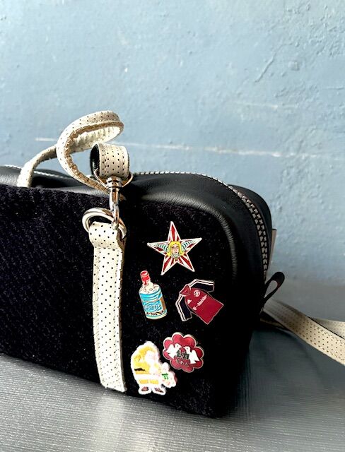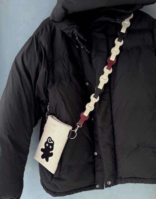 既成の綿の平たいトートに野球のグローブの端革でいろいろ付いてます
